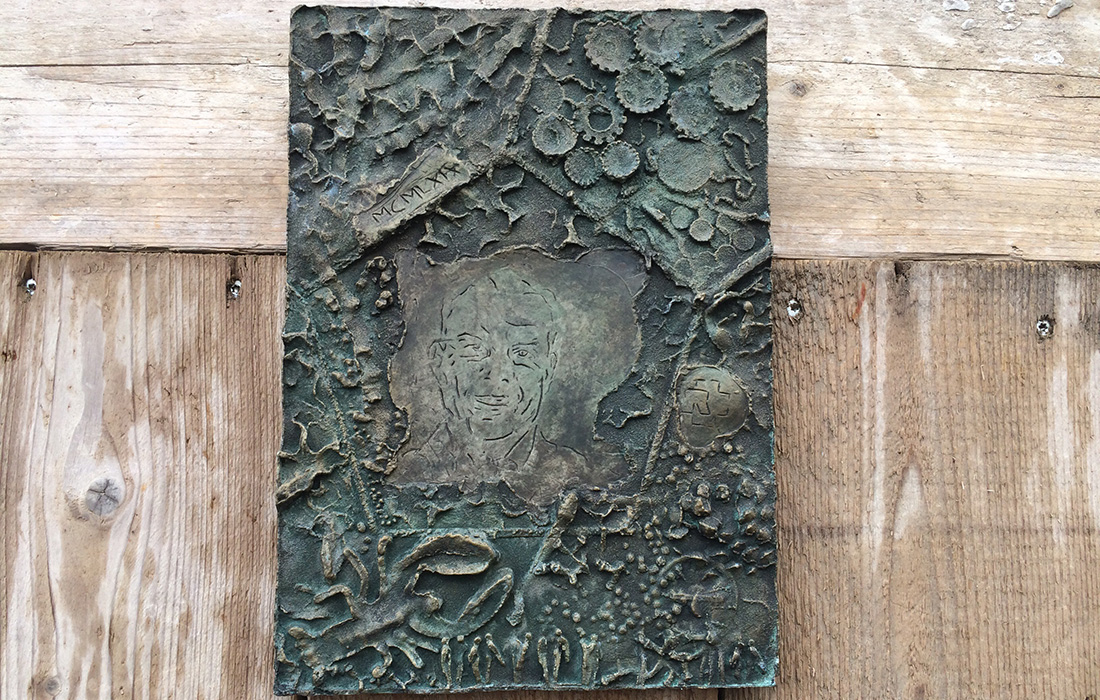 Persoonlijk kunstwerk ter ere van een vijftigjarige verjaardag, het centrale element in de rechthoekige sculptuur is een lijntekening van de jarige zelf.