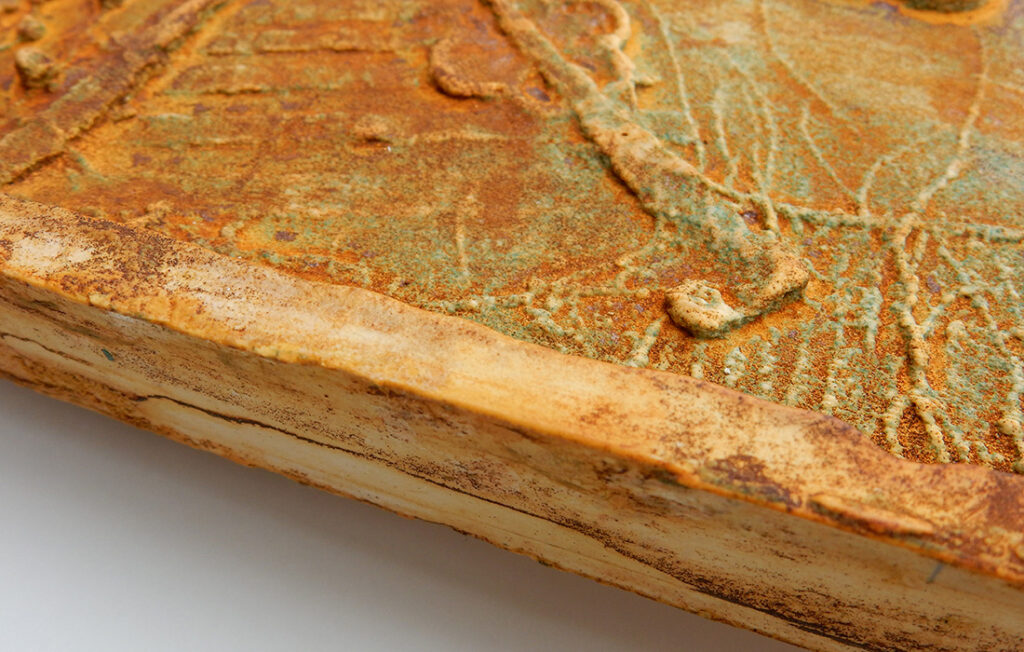 Om de wetenschappelijke inhoud verder te benadrukken, zijn symbolen van eiwitten die een rol spelen in het methaanomzettingsproces in reliëf weergegeven. Deze complexe eiwitten zijn verantwoordelijk voor het denaturatieproces, waarbij eiwitten hun oorspronkelijke structuur verliezen om chemische reacties mogelijk te maken. De hoog- en diepliggende patronen die op het werk zijn verwerkt, illustreren dit proces en geven het kunstwerk diepte en textuur.